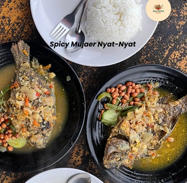 Unlike deep-fried or heavily grilled dishes, Mujaer Nyat-Nyat is cooked in a light broth infused with traditional Balinese spices such as shallots, garlic, chili, turmeric, and aromatic herbs. This cooking method keeps the fish moist while enhancing its natural flavor rather than overpowering it.